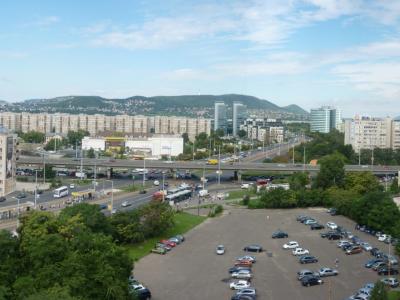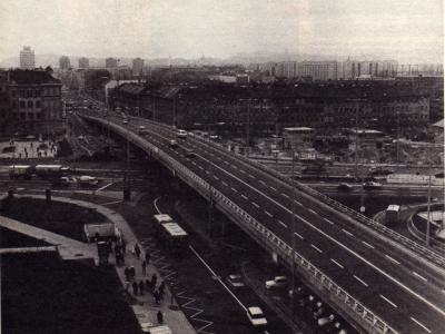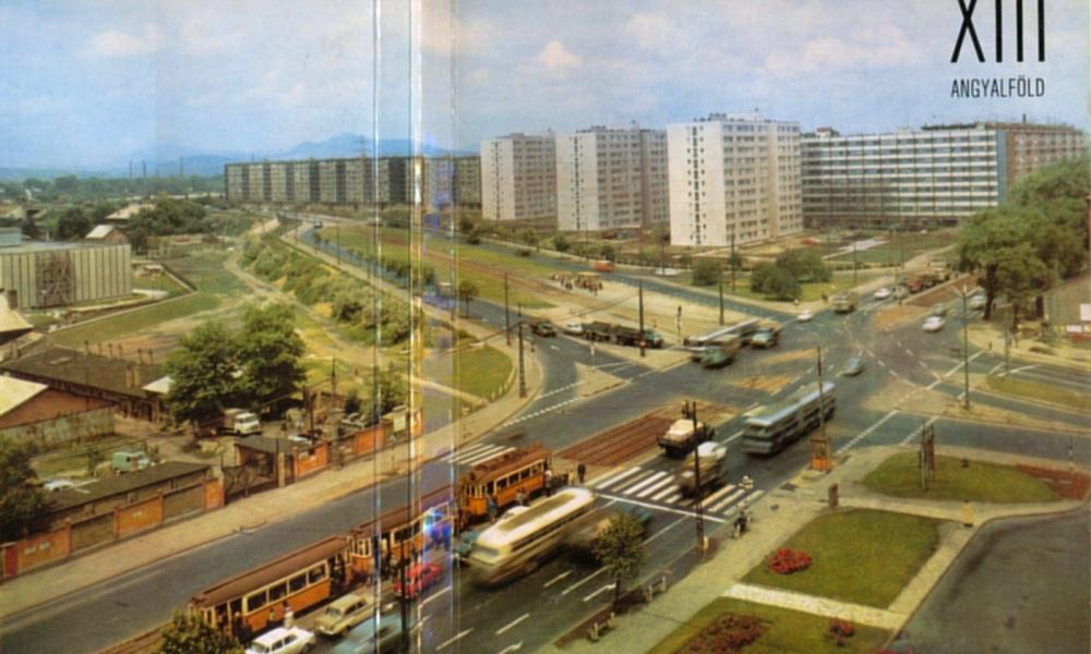Az Árpád híd lejárójának és a Váci útnak a kereszteződése, a Váci úti felüljáró még nem létezik.